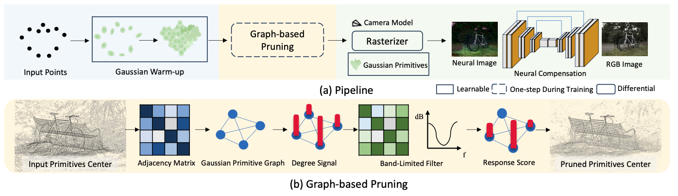 (a) Pipeline: Our proposed method warms up a 3D Gaussian field firstly, followed by a Graph-based pruning strategy to down-sample the Gaussian primitives, and a convolutional neural network to compensate the losses caused by pruning.