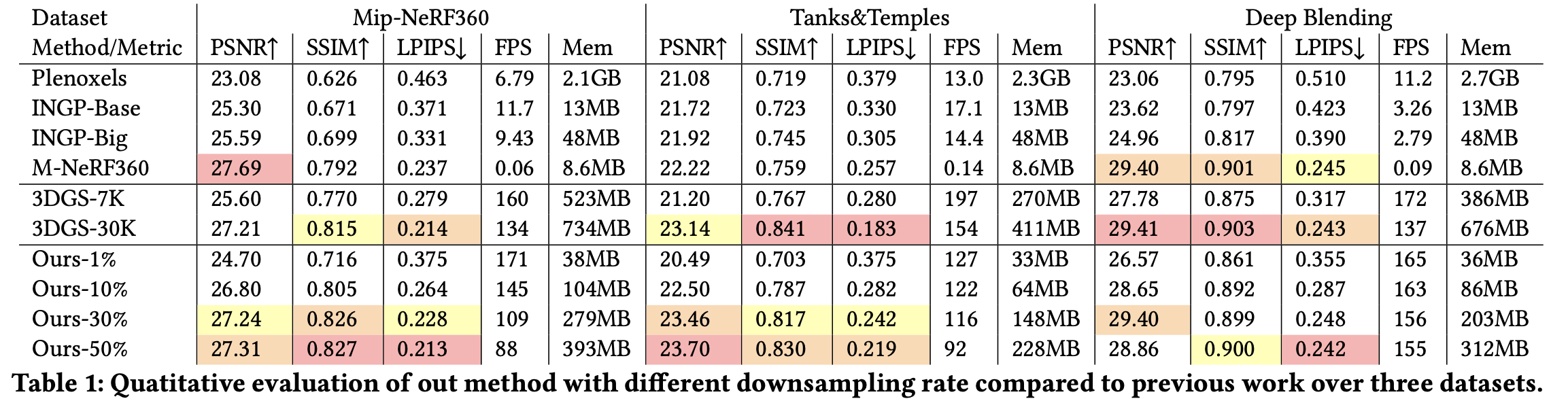 Our method effectively balances high rendering performance, speed, and efficient memory usage, demonstrating significant advancements. Specifically, at 30% and 50% sampling rates, it manages to deliver top-tier performance metrics while achieving rapid rendering speeds of 88 FPS and maintaining a manageable memory footprint of 393MB. This balance showcases the strength of our spectral pruning and neural compensation techniques, which adeptly handle the relationships among Gaussian primitives, ensuring minimal quality loss even when reducing the abundance of primitives. The efficiency of our approach is further highlighted by the SUNDAE variant, which at very low sampling rates like 10% and even 1%, still offers remarkable rendering efficiency and reduced memory demands, maintaining competitive image quality. Overall, our method stands out for its robustness and capability to optimize the trade-offs between quality, speed, and memory usage in complex rendering environments.