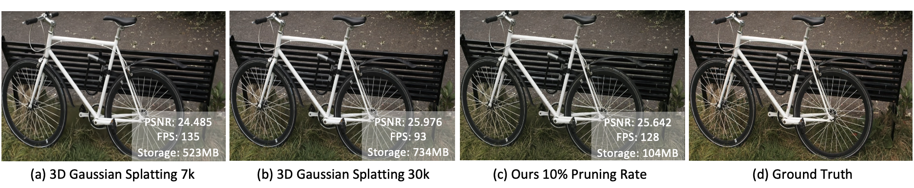 (a) 3D Gaussian splatting (3DGS) results trained for 7K iterations. (b) 3DGS results trained for 30K iterations, in whichmore Gaussian primitives are allocated so quality gets higher, speed gets slower, and storage gets larger compared to (a). (c) SUNDAE results by pruning 90% primitives upon (a), being much smaller in storage, more accurate and a little bit slower than (a). Note that the storage usage is not 10% of (a) because an additional neural compensation head is used.