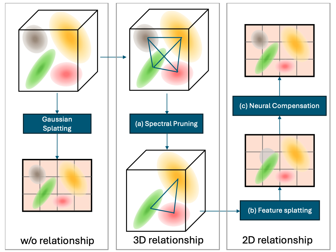 Relationship among Gaussian Primitives. The left panel shows vanilla 3D Gaussian splatting, which requires a large amount of storage as it does not capture the relationship between primitives. The middle panel shows our spectral pruning technique that is based upon the relationship between 3D Gaussians. The right panel shows that the neural compensation head exploits the relationship between 2D feature splatting results to improve rendering.